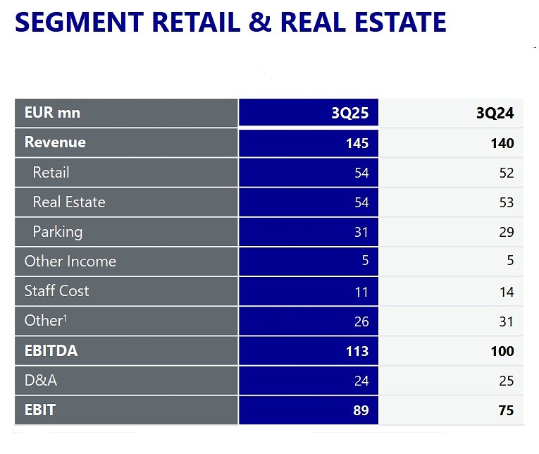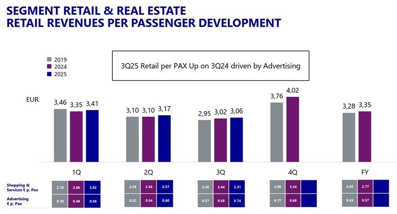 Zieschang also had a positive story to tell on the retail and retail estate business at FRA in Q3. The segment revenue increased by +3.4% to €145 million, with retail outperforming at +4.2% (see chart above). For the retail division overall, Q3 profitability grew significantly: EBITDA hit €113 million, and EBIT €89 million, helped by top-line developments and positive traffic development in the reporting period.