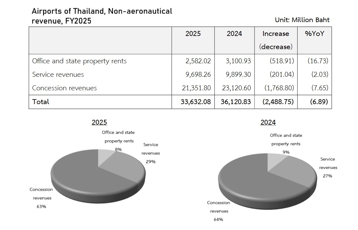 The concessions segment remains the backbone of the non-aeronautical division with a 63% share, so its contraction impacted the entire business. Total non‑aeronautical revenue fell to THB33,632 million/$1.04 billion.