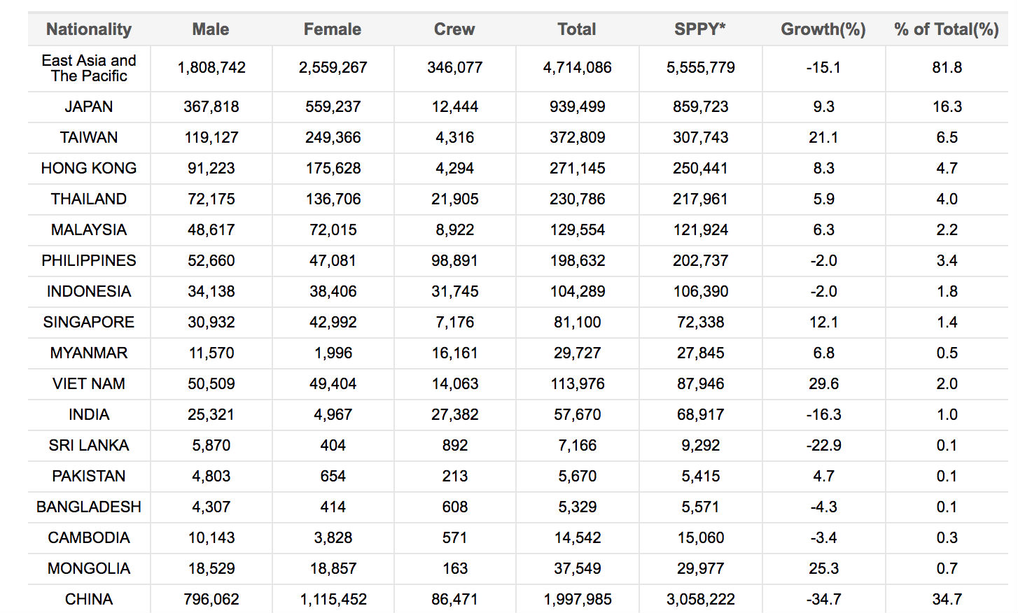On a brighter note, visitor arrivals from Taiwan increased by 21.1% to total 372,809 during the period, alongside Japan with growth of +9.3% to 939,499.