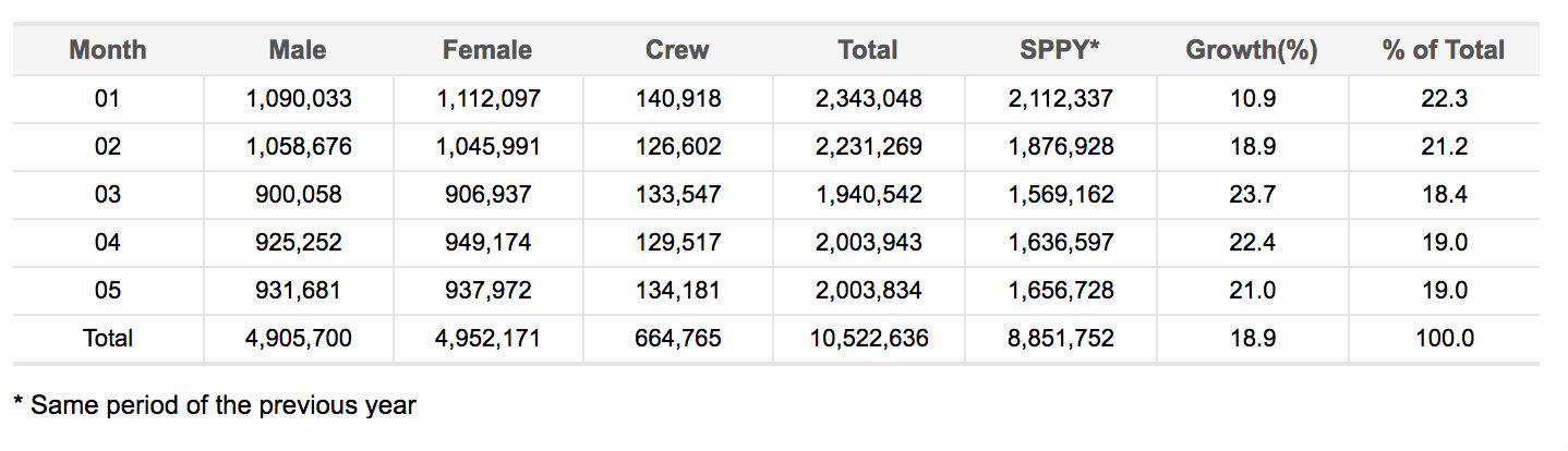 Korean departures have grown by 18.9% to reach 10,522,636 between January to May. Click to enlarge. Source: Korea Tourism Organisation.