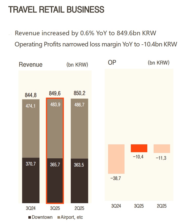 While the hotels and leisure business has a solid performance in both revenue and operating profit, Hotel Shilla’s business is heavily reliant on its travel retail arm, which accounted for 83% of revenue in Q3. The parent said that its more consequential division suffered a revenue decline of -1.3% YoY in its downtown business while airport revenue increased by +2% YoY.