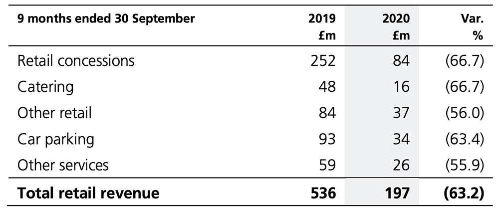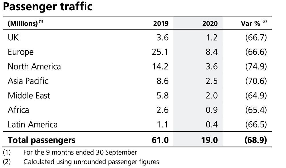 Total revenue losses widened to £1.5 billion in the first nine months of this year as passenger numbers in Q3 remained down over 84%. Q3 revenue fell 72% to £239 million and Q3 adjusted EBITDA fell to £37 million.