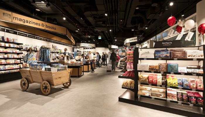 It is split into different zones: magazines and newspapers, books, souvenirs, food, convenience items and travel goods.