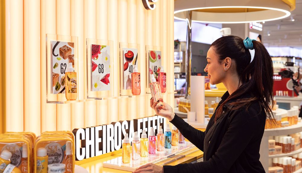 Key features include core tables to spotlight new products and bestsellers, Cheirosa fragrance displays, and screens designed to blend digital activation with product storytelling.