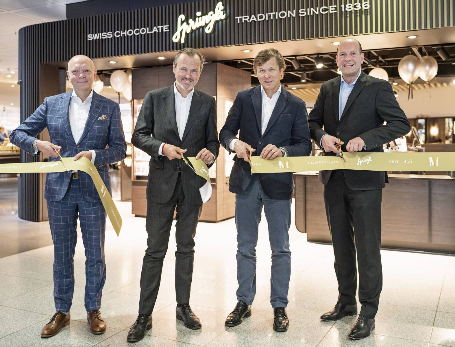 The opening of the new store at Terminal 2 airside. Pictured left to right: Sven Zahn, Managing Director, Eurotrade; Milan Prenosil, Chairman of the Board, Sprüngli; Tomas Prenosil, Chief Executive Officer, Sprüngli; and Dr. Jan-Henrik Andersson, Chief Commercial Officer, Munich Airport.