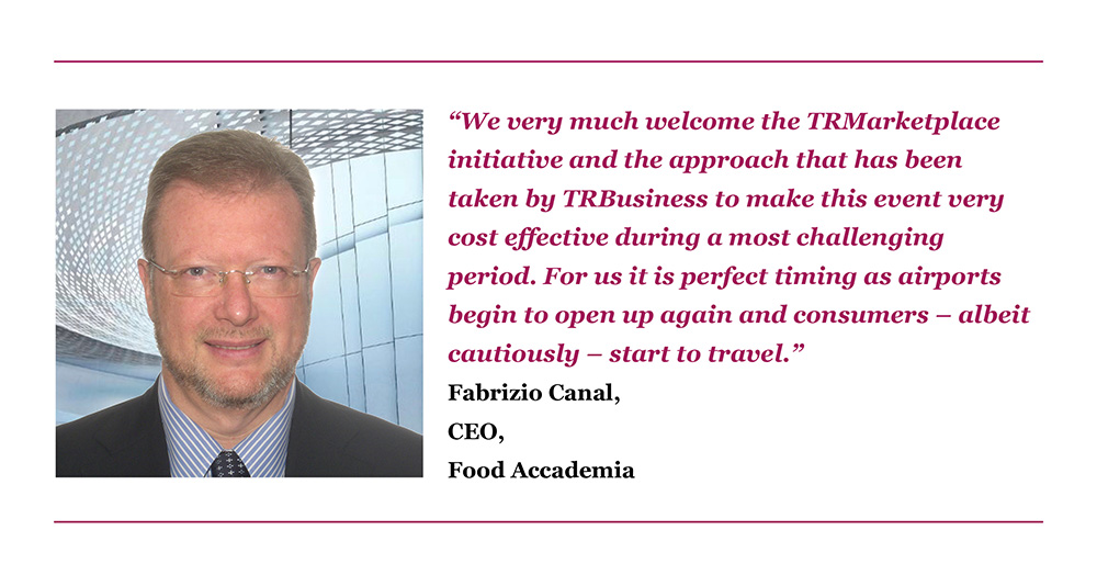 “We very much welcome the TRMarketplace initiative and the approach that has been taken by TRBusiness to make this event very cost effective during a most challenging period. For us it is perfect timing as airports begin to open up again and consumers – albeit cautiously – start to travel,” said Fabrizio Canal, CEO, Food Accademia.