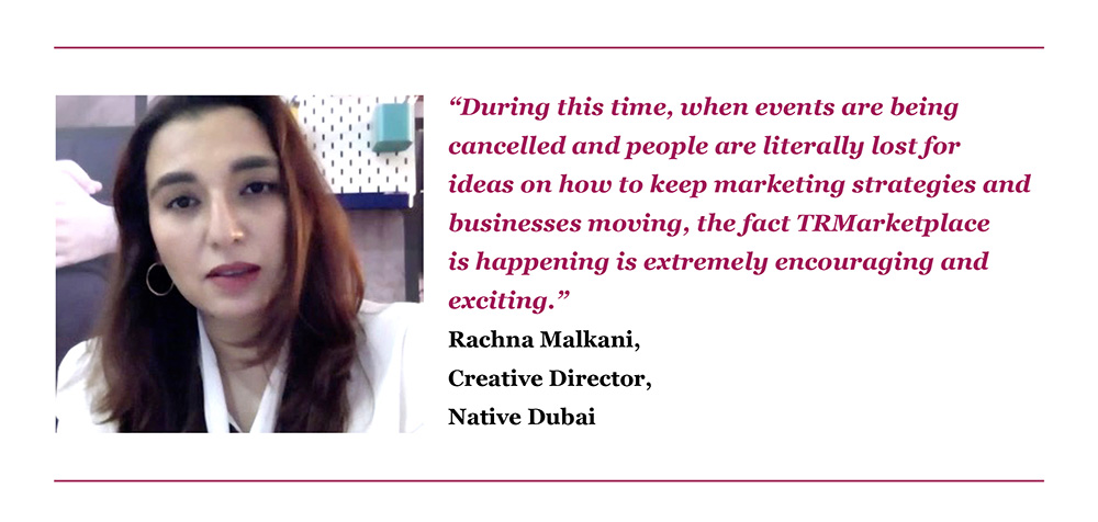 For Rachna Malkani, Creative Director, Native Dubai, TRMarketplace promises to inspire and motivate attendees and exhibitors alike. “During this time, when events are being cancelled and people are literally lost for ideas on how to keep marketing strategies and businesses moving, the fact TRMarketplace is happening is extremely encouraging and exciting.”